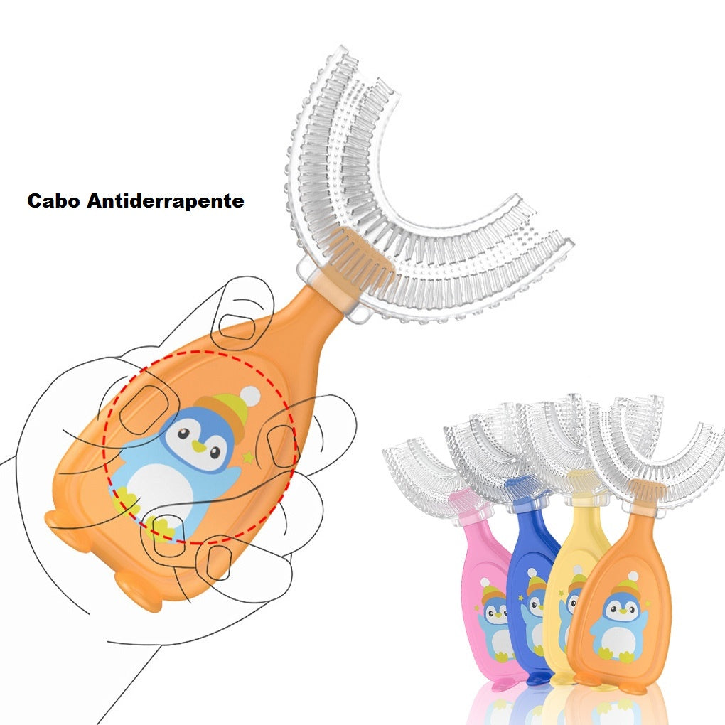 Escova de dente infantil formato ou A escova de dente infantil em formato U, é a única com tecnologia capaz de escovar todos os dentes de uma só vez.